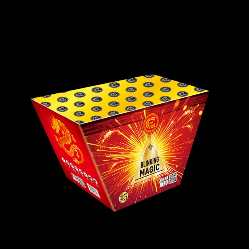 BLINKING MAGIC. 25 shot cake. Deep red strobe tail spit white strobe w/red/green/blue/lemon/purple. RETAIL
