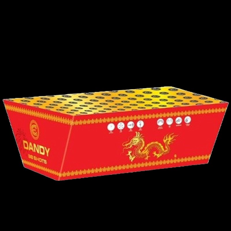 DANDY. 98 shot cake. Z firing strobe mines to spit coloured strobe effects, finishing with volleys of spit coloured strobes with coloured comets with a climax of crackle lift. RETAIL