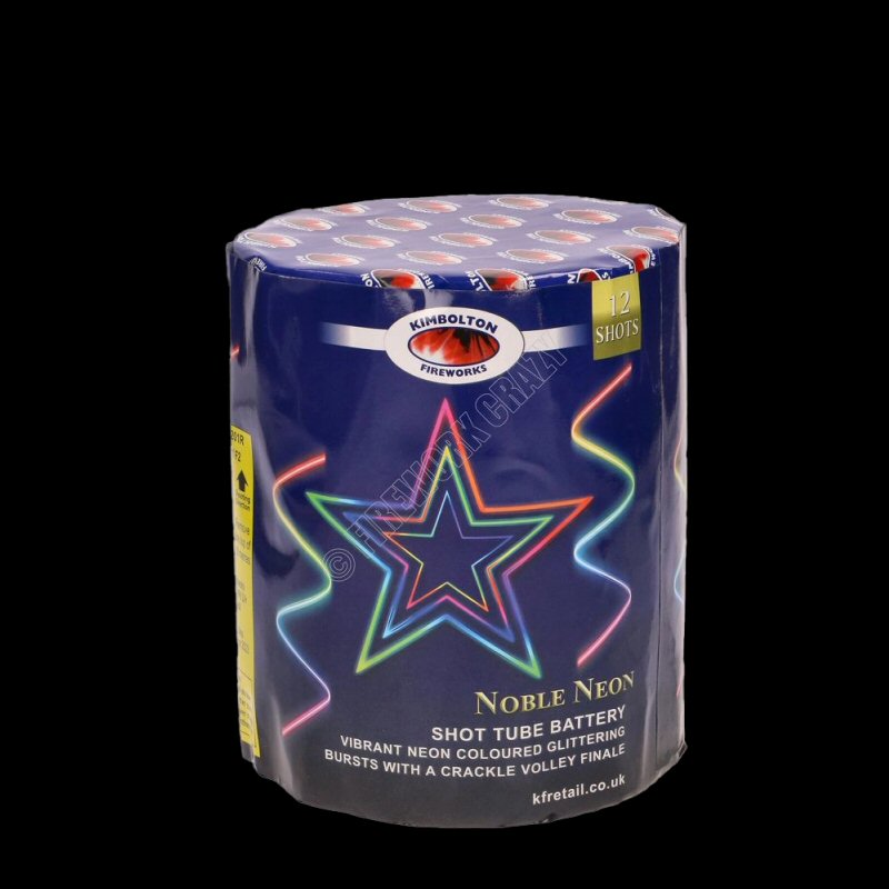 Vibrant neon coloured bursts with glitter, great variety, finale crackle volley with blue stars.